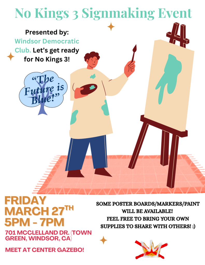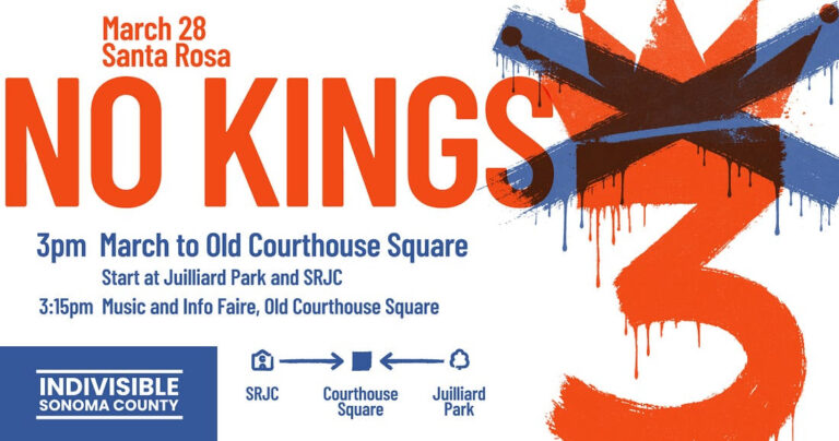 The first No Kings March of 2026 will be held on Saturday, March 28. The march in Santa Rosa will convene at Julliard Park and Santa Rosa Junior College at 3pm for a march to Old Courthouse Square. Other marches and rallies in Sonoma County are scheduled for Cloverdale, Healdsburg, Windsor, Petaluma, Cotati, Sonoma Valley, Sebastopol, Graton, Guerneville, Bodega Bay, Timber Cove, and Jenner. See Indivisible Sonoma calendar for details.